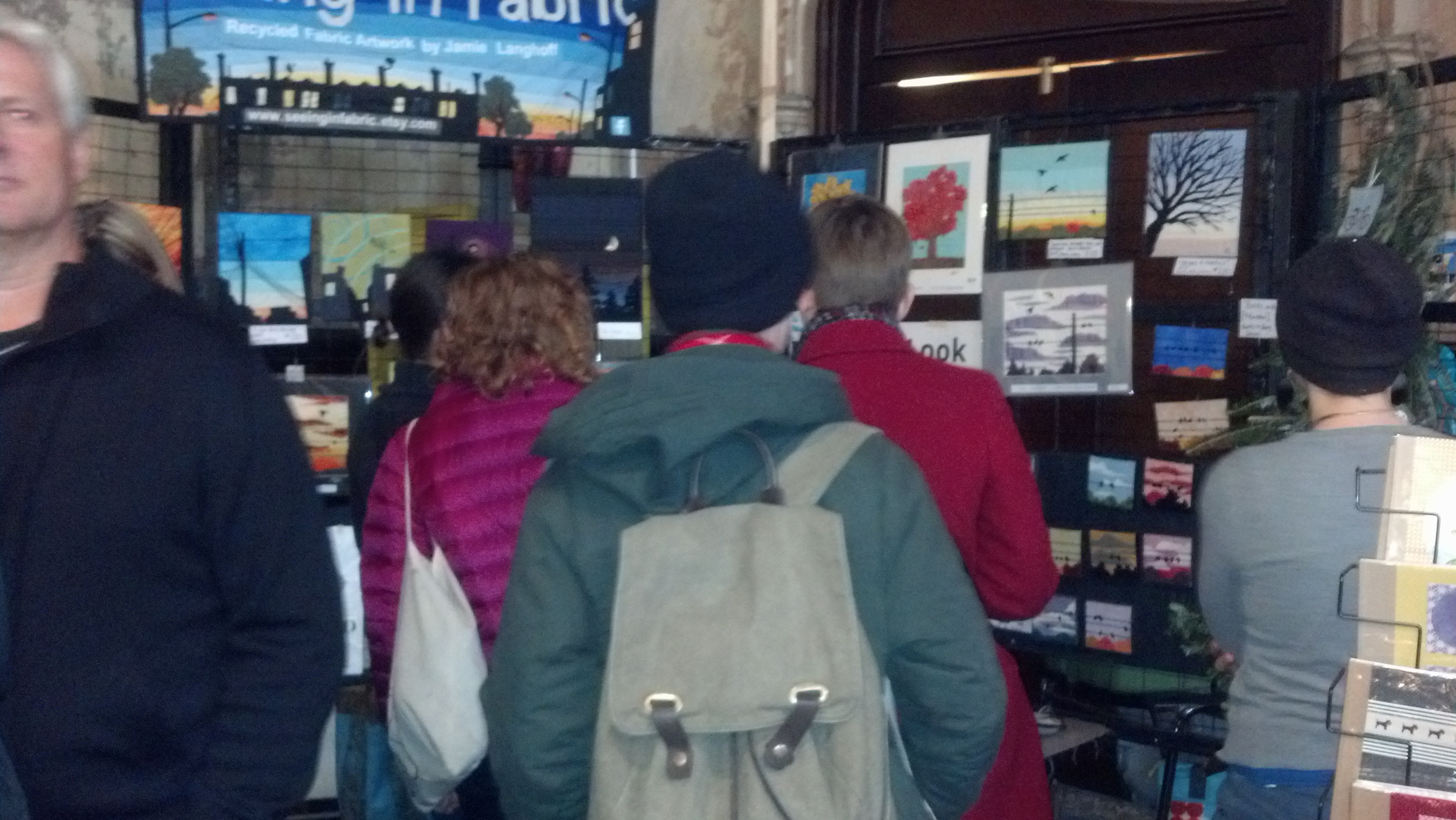 If you are interest in fabric arts, like I am, you would like Seeing in Fabric. Jamie creates applique artwork out of up-cycled fabric. She has an old sewing machine that she sews with and she uses simple stitches to create the artwork. I tried to get a picture of her display, but it was a popular booth.