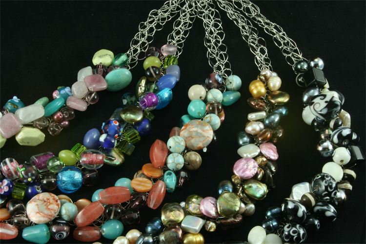 She creates one-of-a-kind crocheted wire necklaces. She actually crochets wire much like you would crochet yarn. She adds various beads, semi-precious stones and fresh water pearls into the crocheted non-tarnishing wire to make beautiful necklaces. Beads are clustered in the lacy crocheted wire, giving the necklaces an light airy feel.
