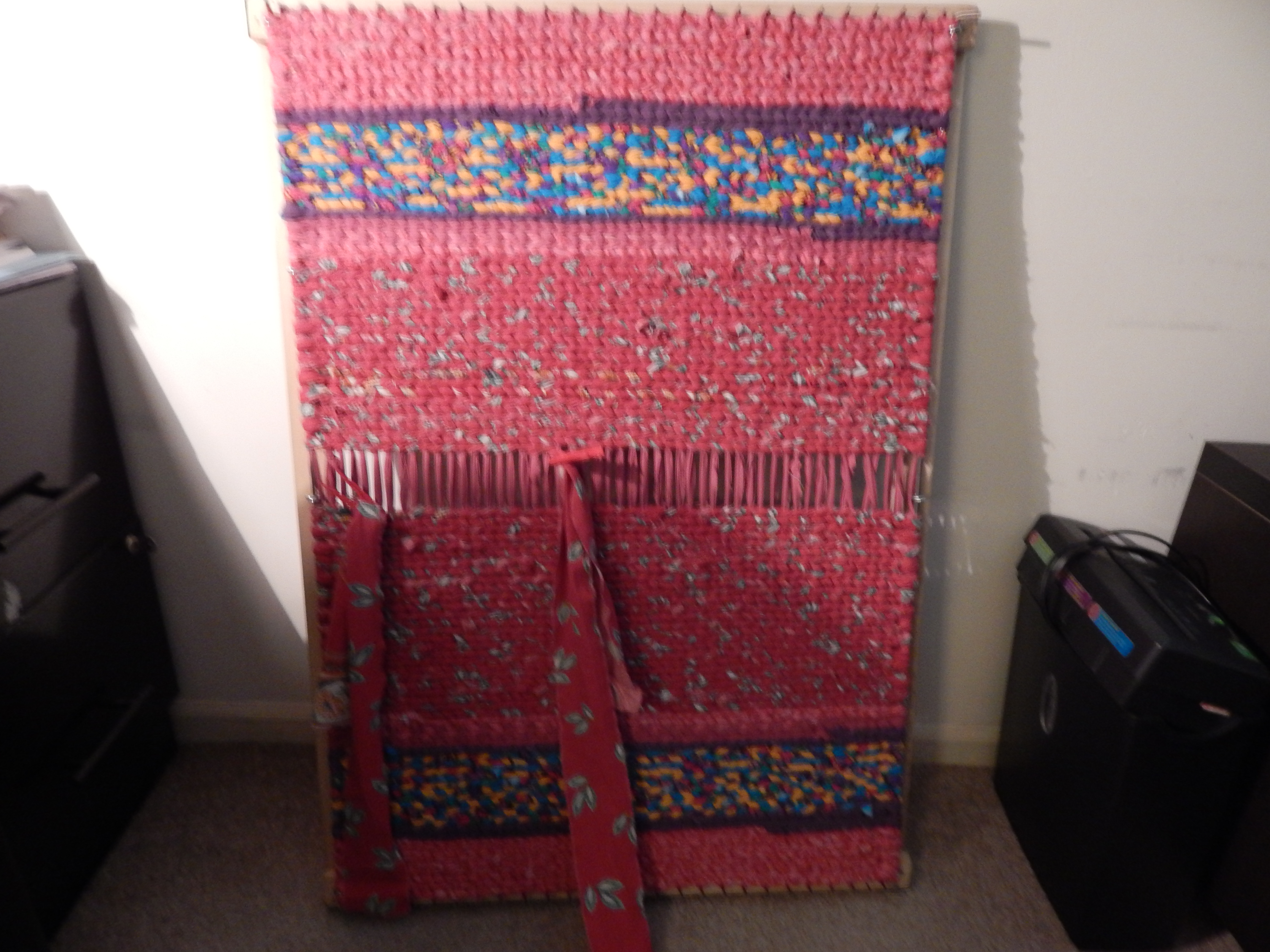 It is interesting how once the strips of pattern material are woven into the rugs and into the baskets it become a different pattern. Norma might be teaching her technique of making rugs in the future.