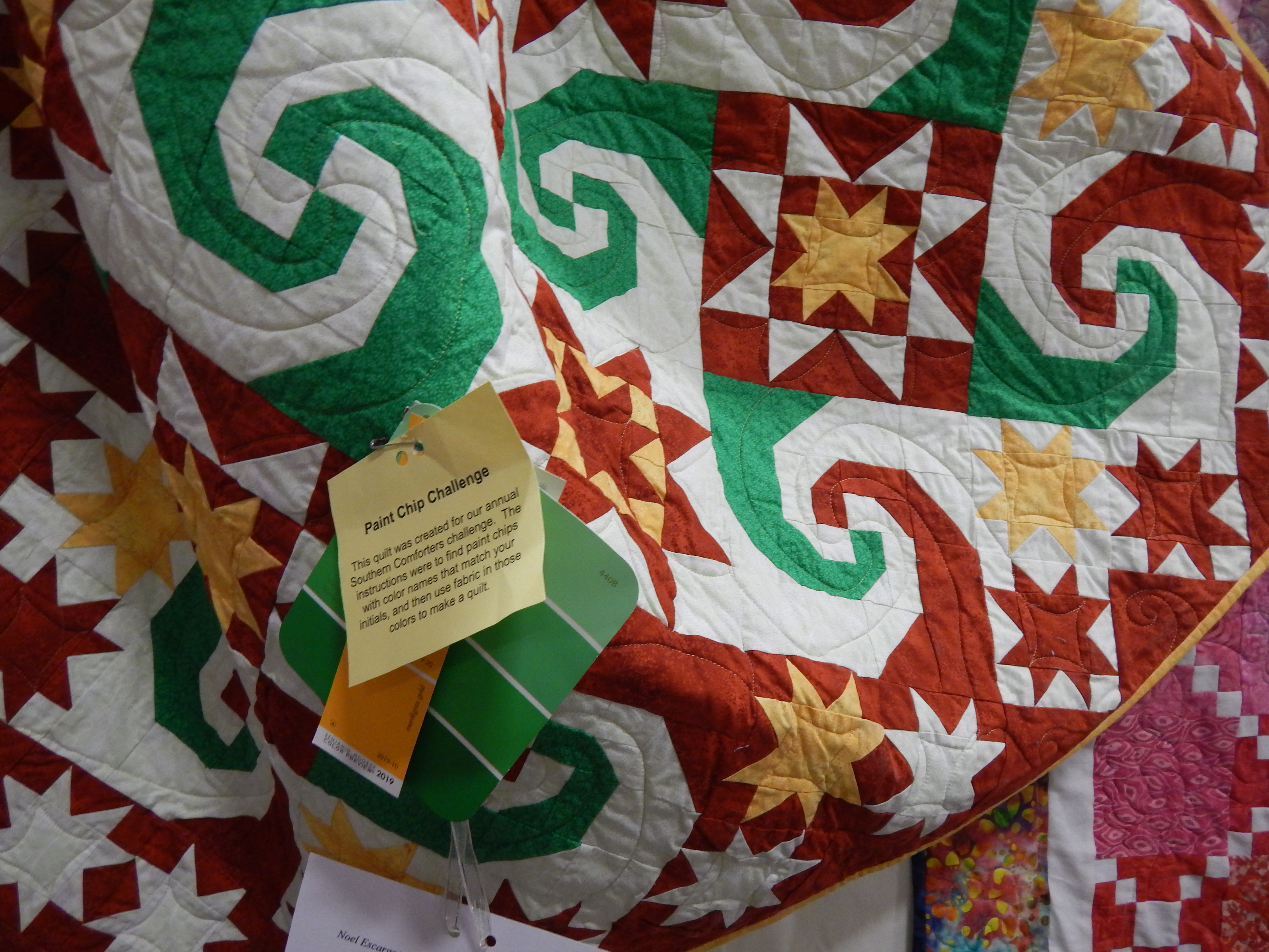 She said some of her inspirations comes from the guild challenges. For example, one challenge was for the quilter to pick paint chips with names starting with the quilter’s initials. Then, match material to the paint chips and design a quilt. Below is her quilt with the paint chips attached.
