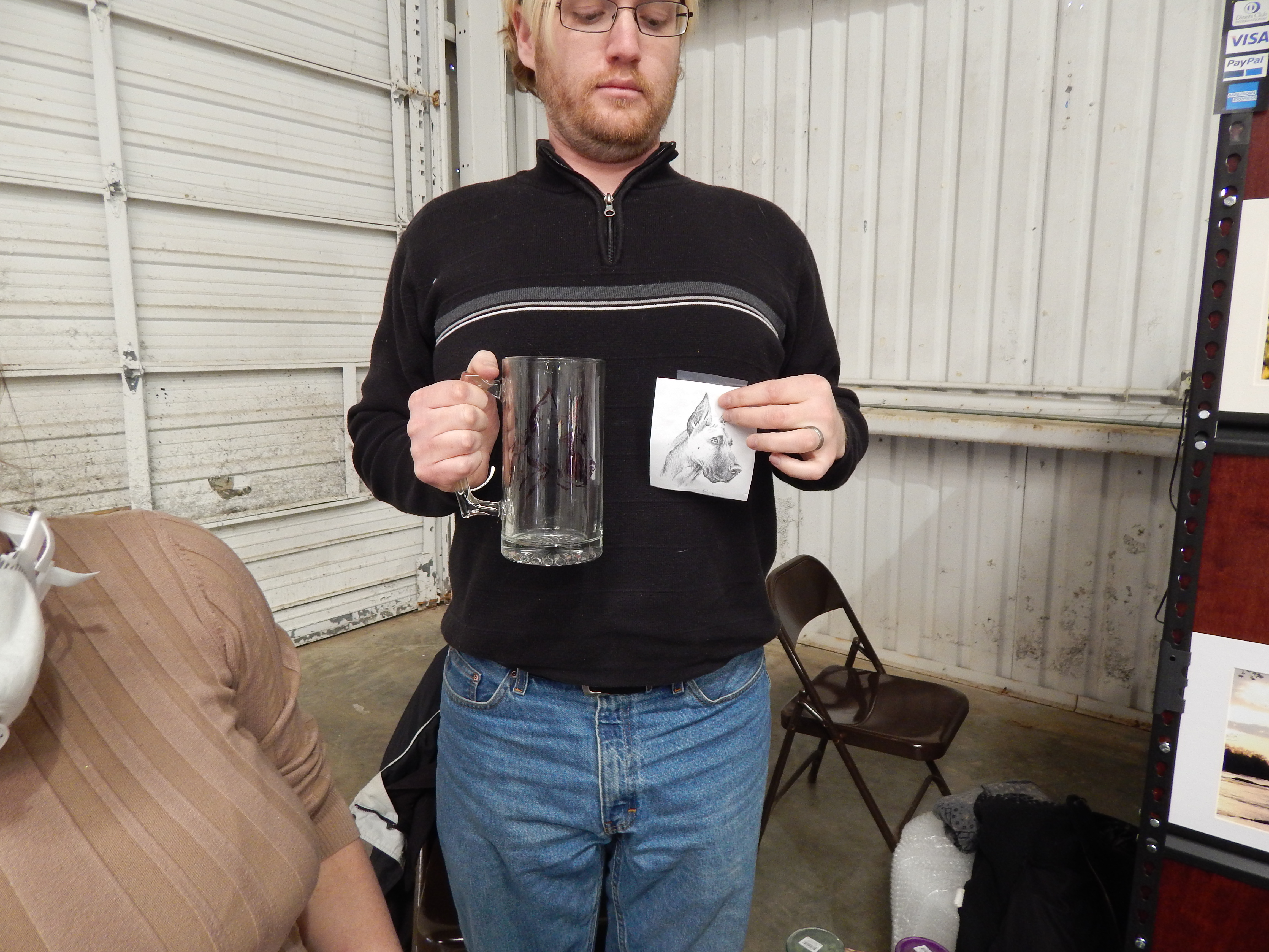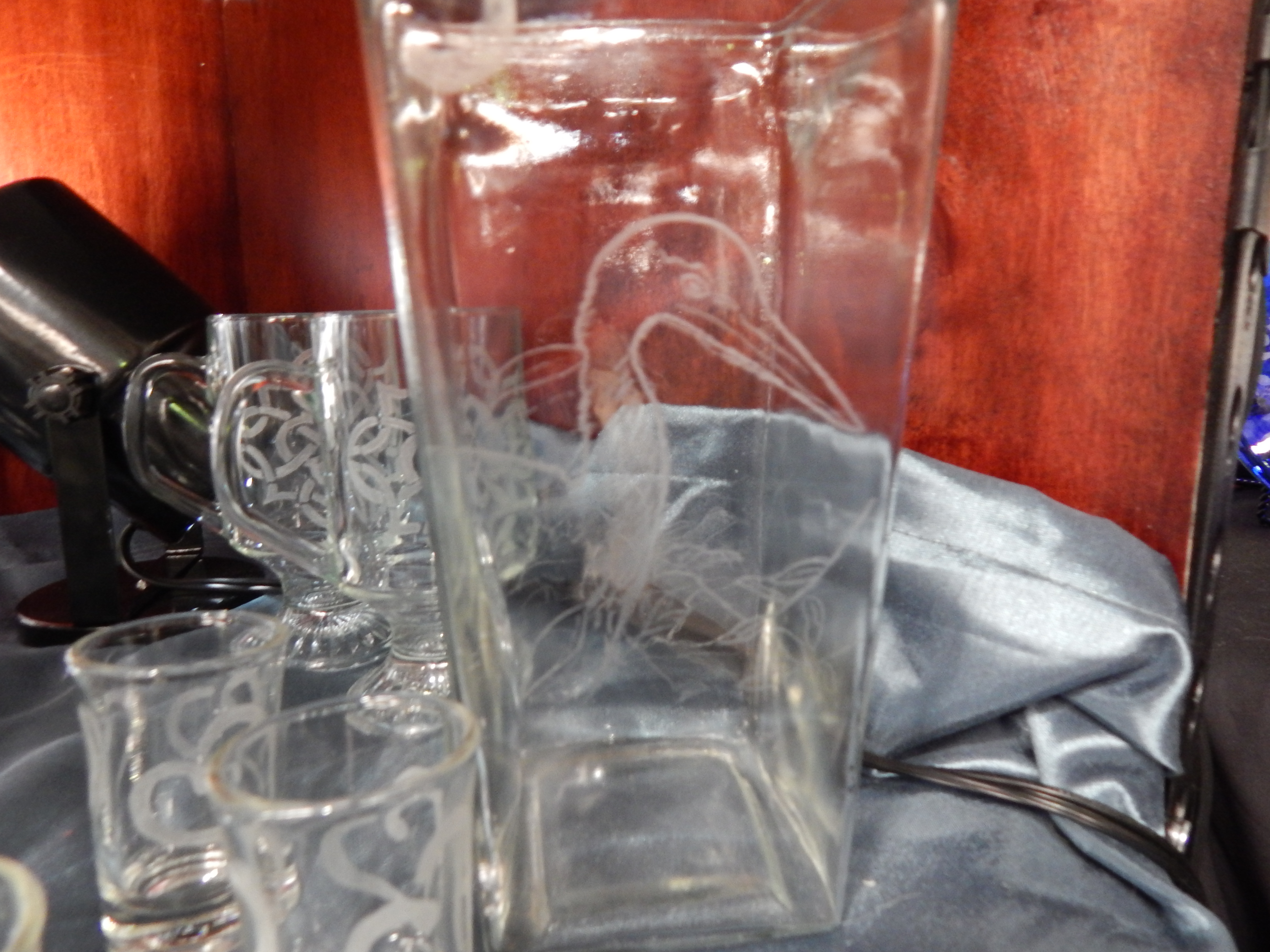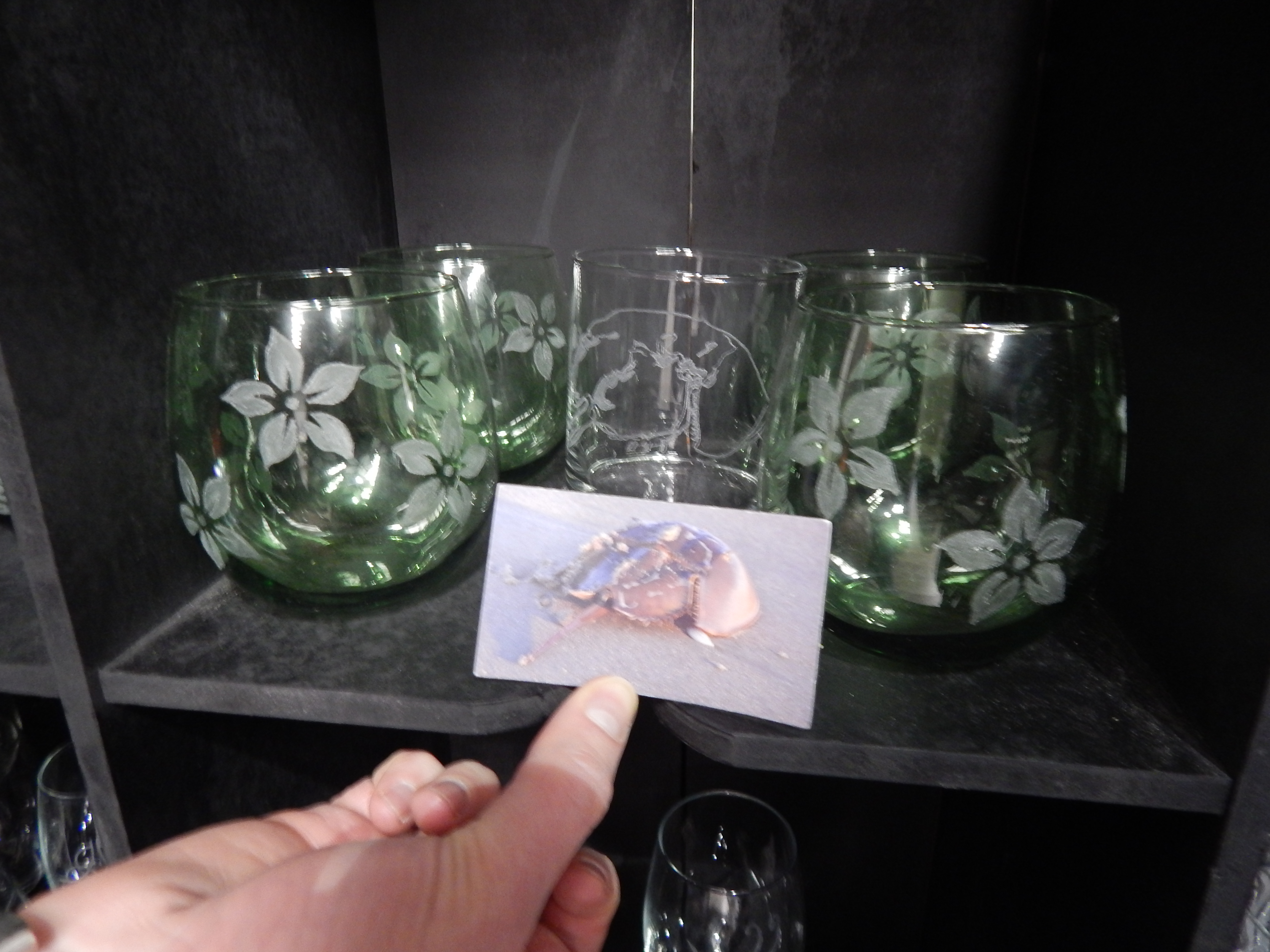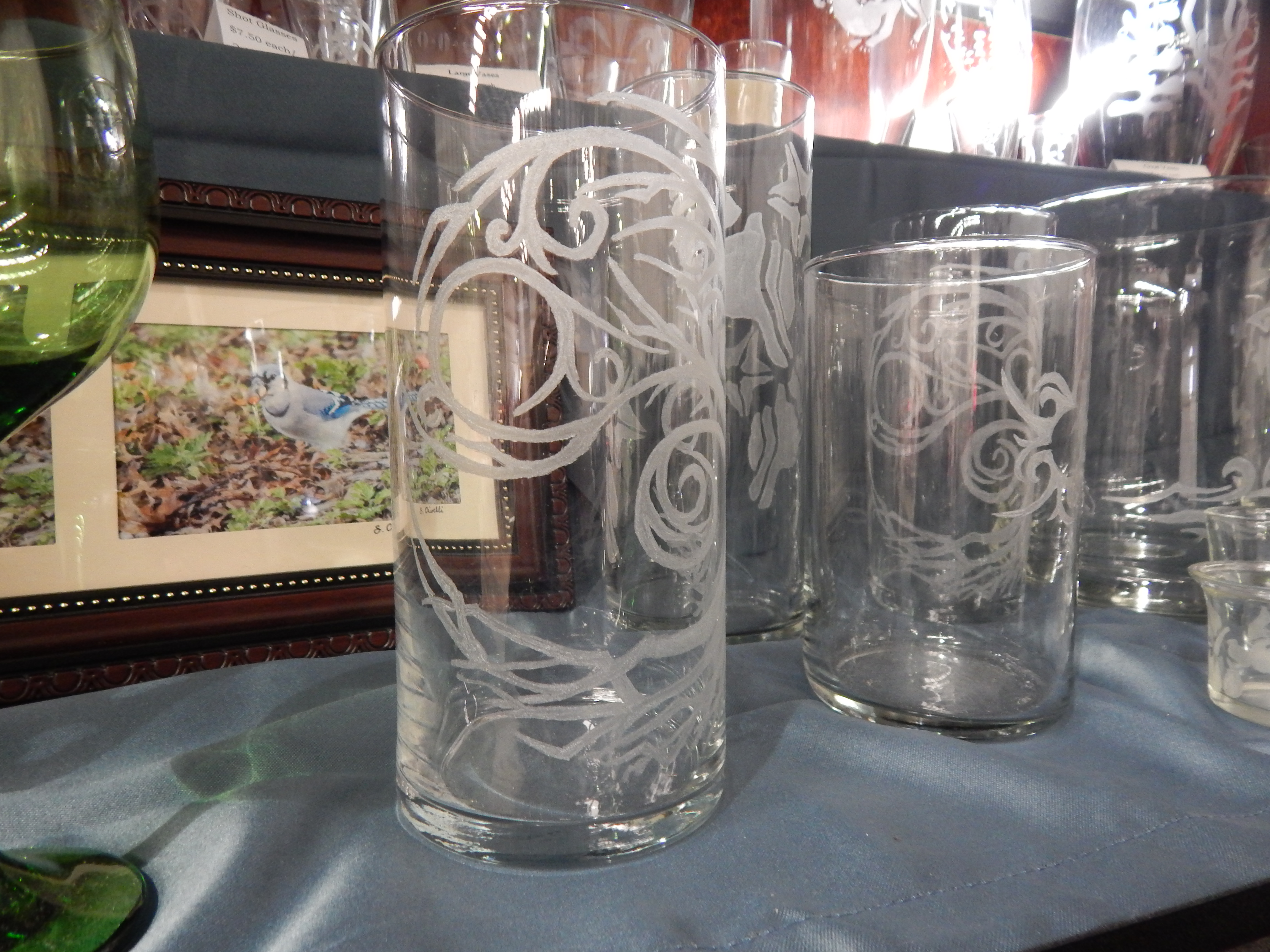 Here are more of her creations. The etched glass can be used and doesn’t need any special cleaning.