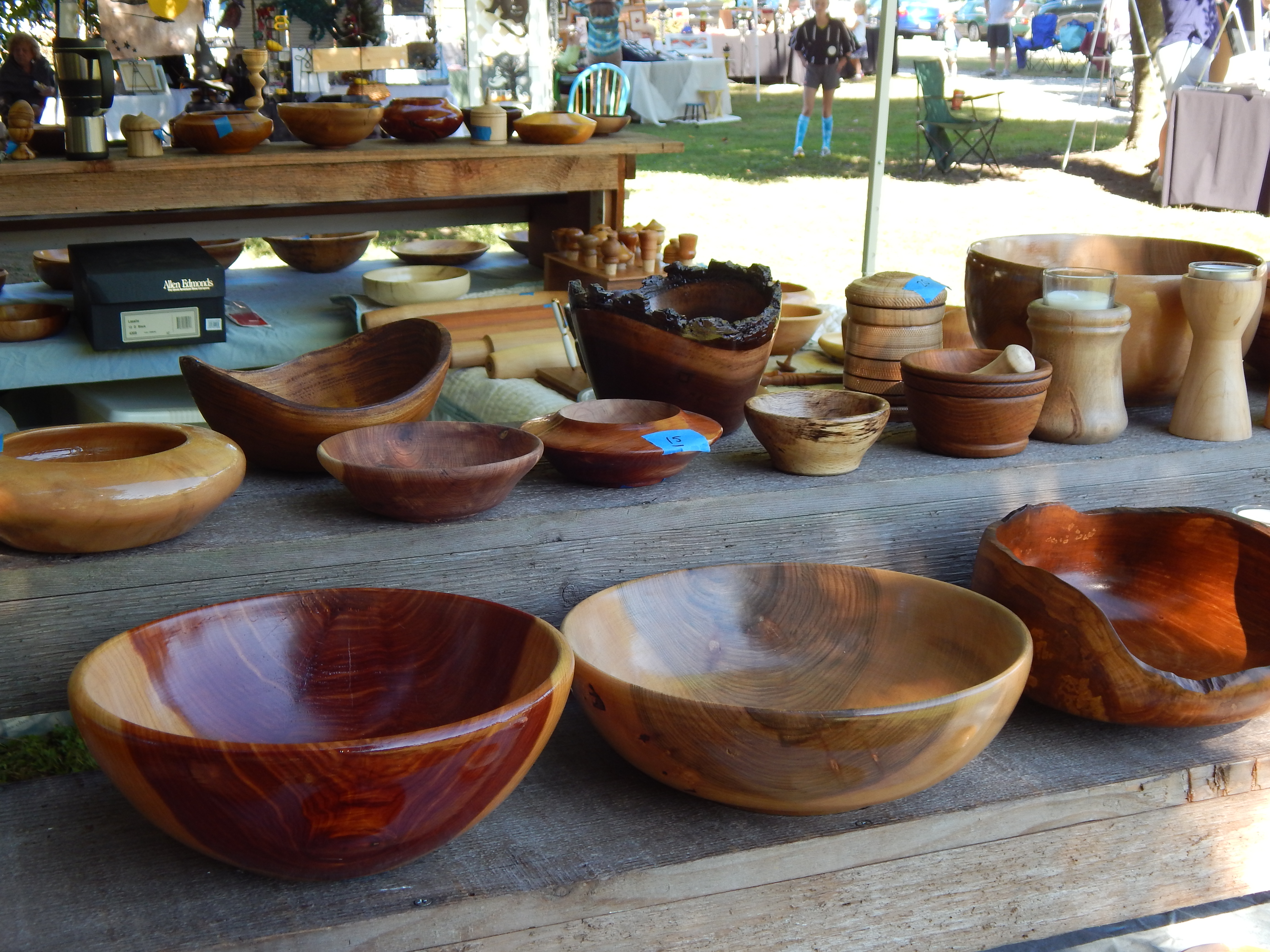 Thomas H. Reynolds, a local wood turner uses reclaimed found local wood to create bowls, dishes, rolling pins and other wooden objects. Most of the wood he uses is from his property or neighbor’s properties. He can tell you about the trees that he used to create his objects and fact the center bowl was created out of a neighbor’s tree that was struck by lightning.