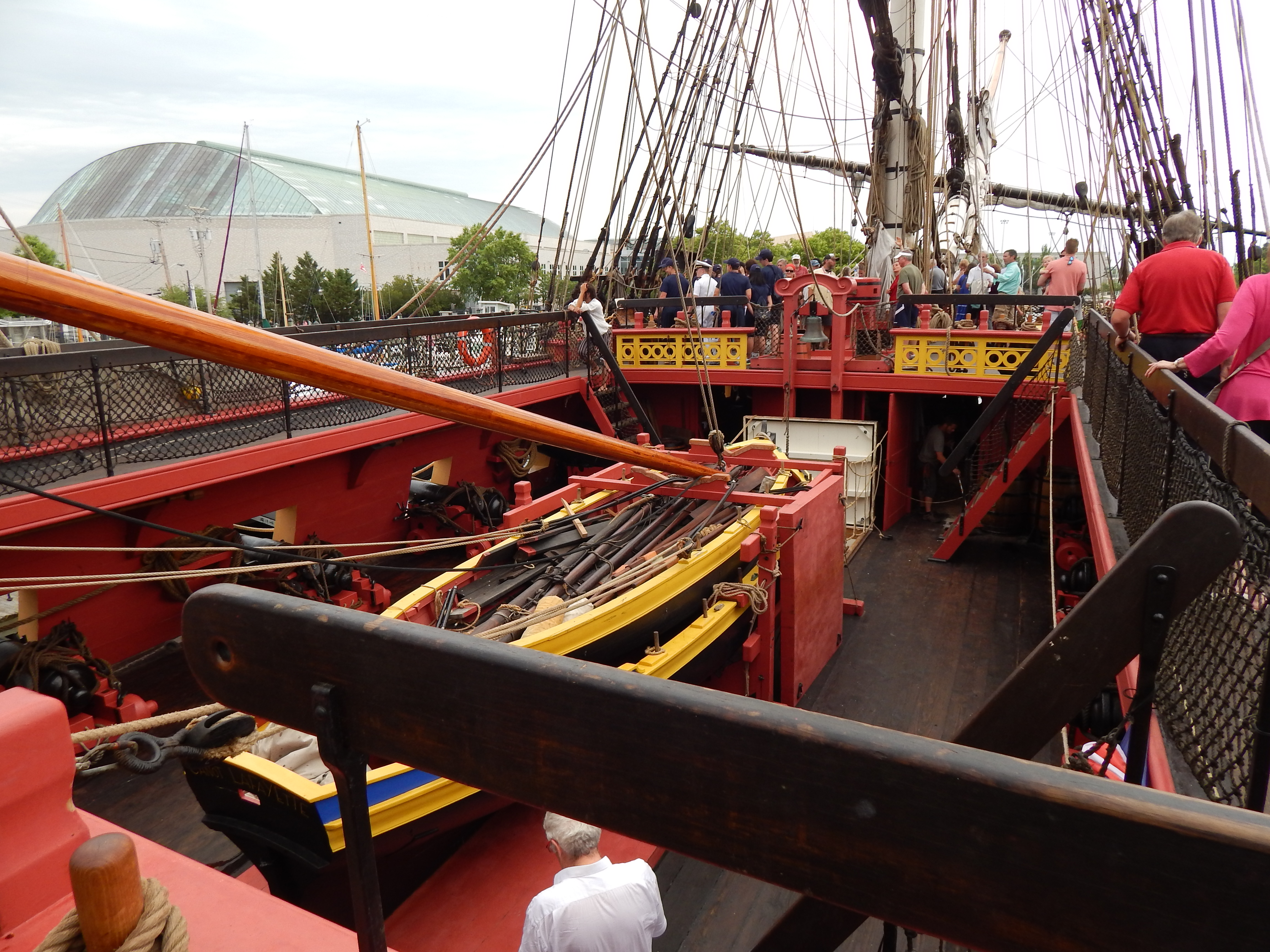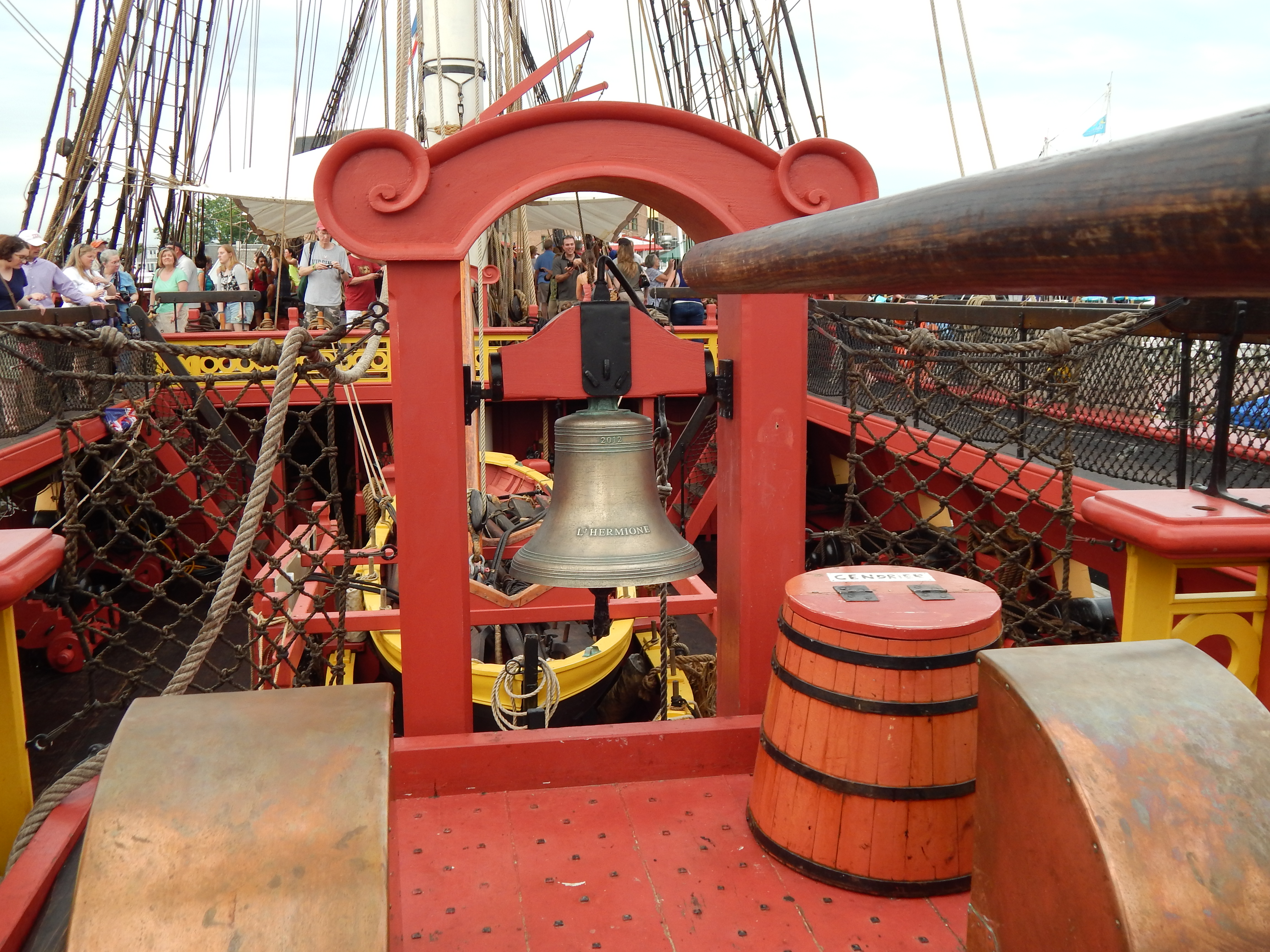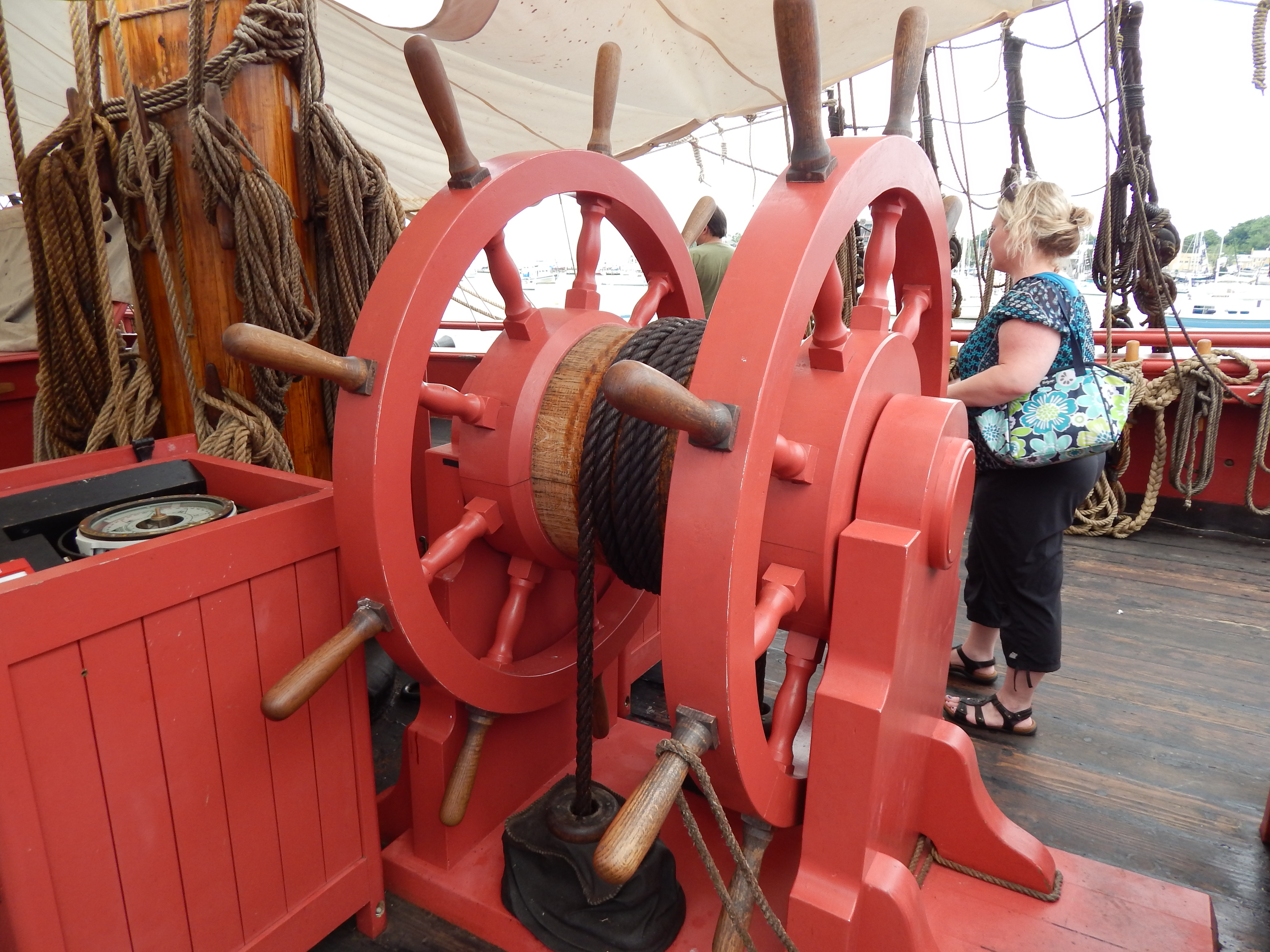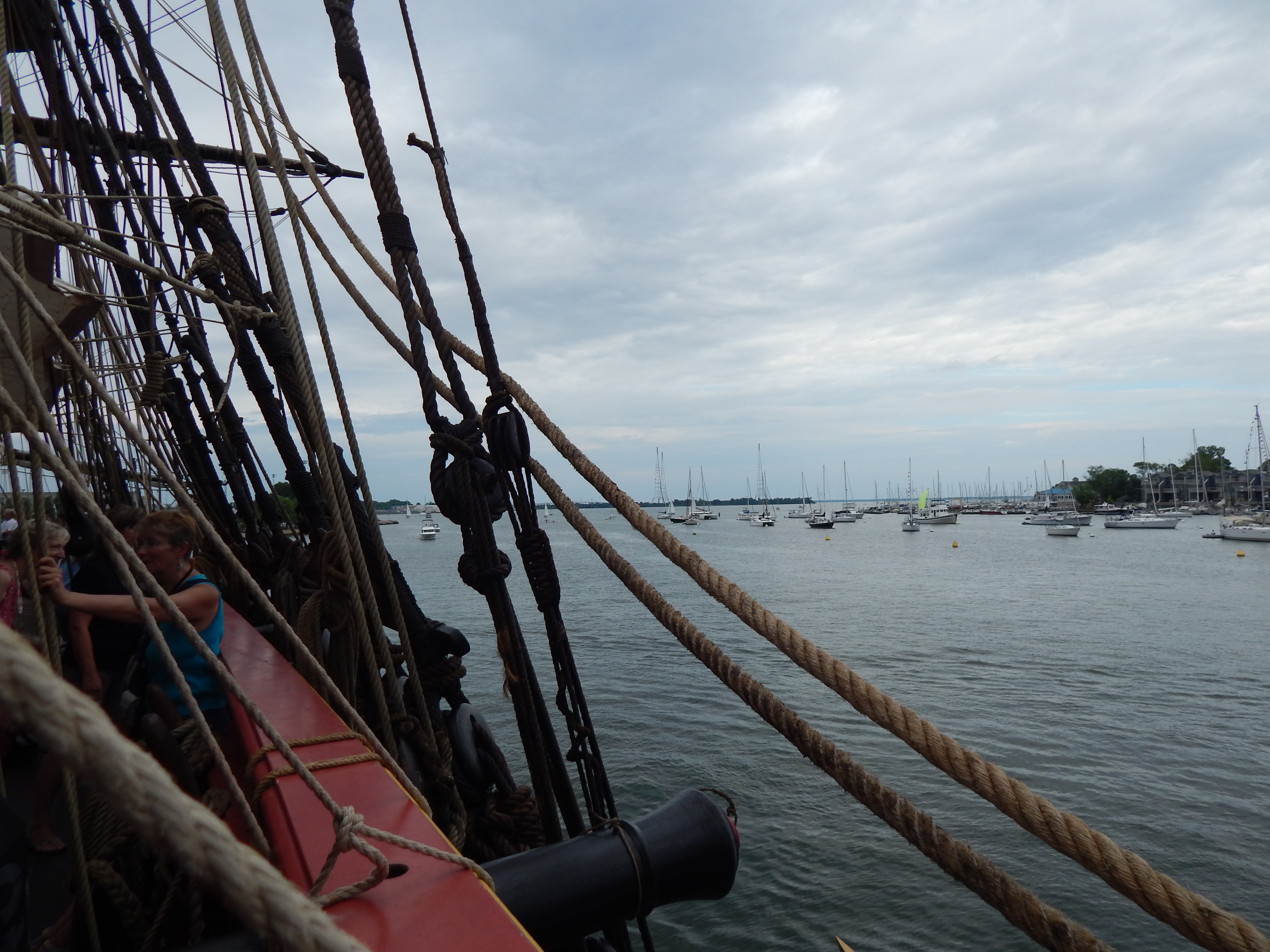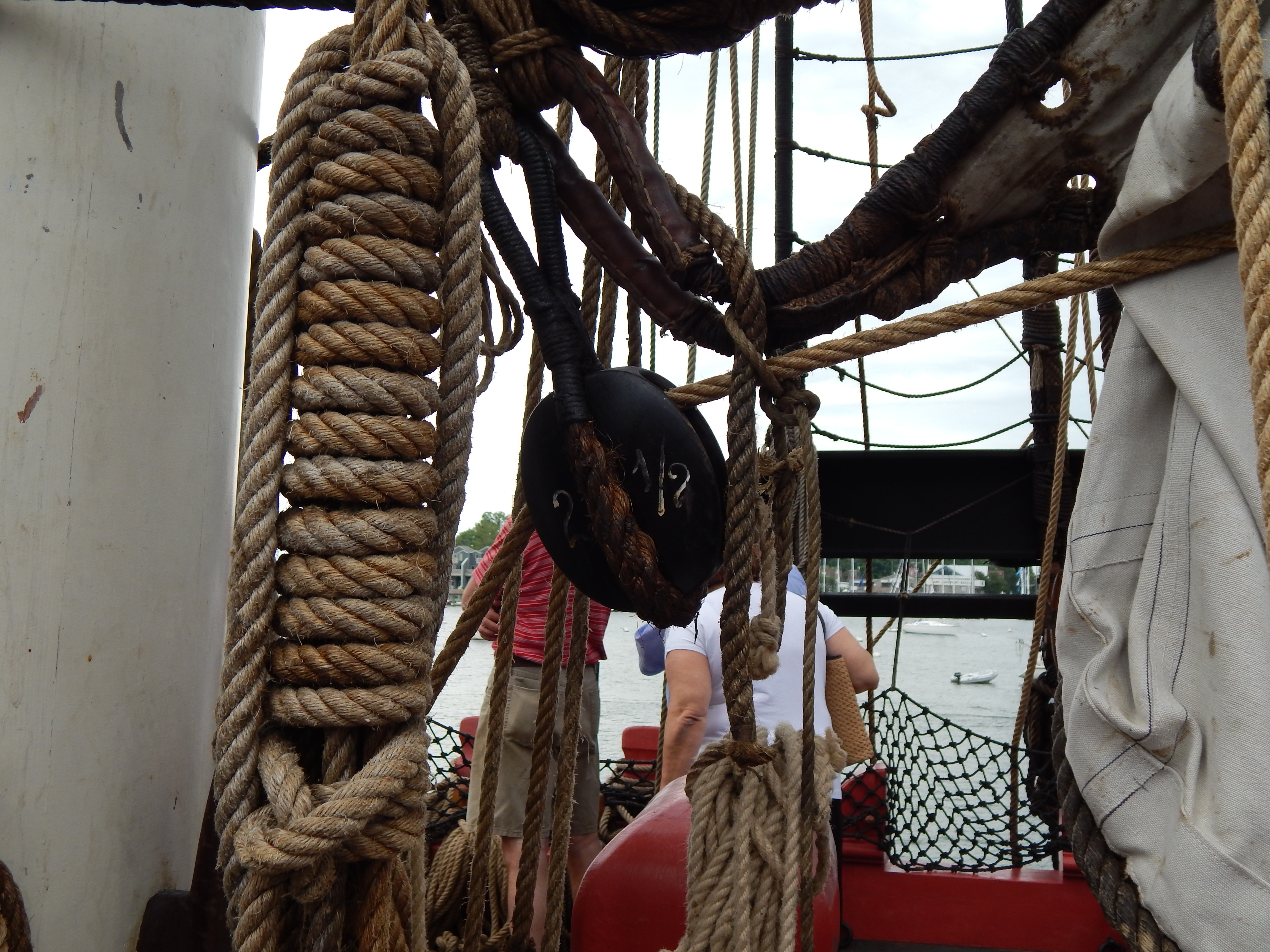 The art of ropes – braided, looped, and tied – all in neat order. The Hermione has 15 miles of ropes and 1000 pulleys on board.