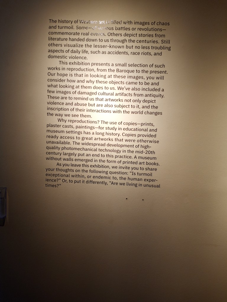 Art can bring pleasure. Breathtaking landscapes, still-life paintings filled with beautiful flowers, all reflections of happy memories. But, art can reminded us of conflicts, chaos, and injustices. I recently attended a Elizabeth Myers Mitchell Art Museum exhibition at St. John’s College Annapolis campus, “theatre of turmoil”. The purpose of this exhibit of reproductions was to raise questions about turmoil and the human experience.